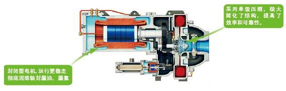 压缩机与电机在封闭在一个壳体中,不易损伤,电机轴直接驱动齿轮工作,无联轴器,无需经常更换联轴器和密封圈,不存在运动密封问题,无制冷剂/润滑油泄露。制冷剂直接冷却,电机温度低(<35℃),线圈不烧毁,电机效率更高,因此机组噪音更低,效率更高。