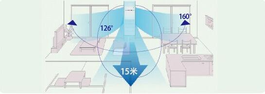 15米超远距离160度广角对流送风,迅速将舒爽遍布每个角落,体现无处不在的关怀。